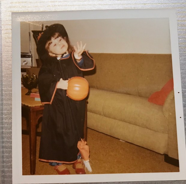 Germany. The very first memory I have of Halloween, is when my dad helped the local teens paint the windows of our apartment building in Germany. I wanted to help, but I wasn’t allowed to hang out with him on the indoor staircase. I have a photo of myself, around the age of four, dressed in a witch costume. I didn’t really understand what witches were about, but I’d seen them in books and movies. For years, I had a great fear of witches.