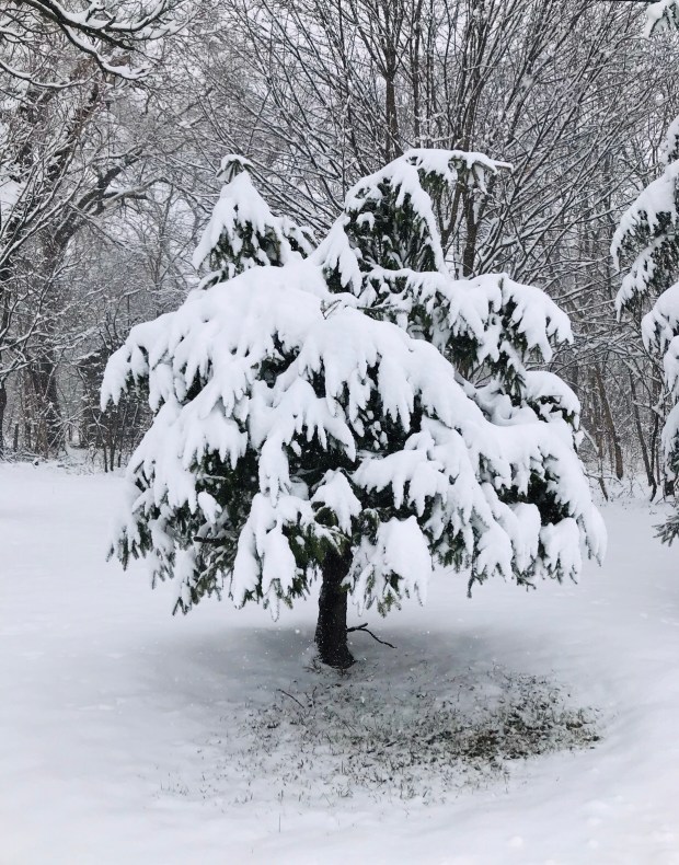 The pine boughs are laden with snow. Too much snow, and the bough breaks. God sent Jesus to carry the burdens which are too heavy for us to carry. We need to release them to God, and trust Him with everything.